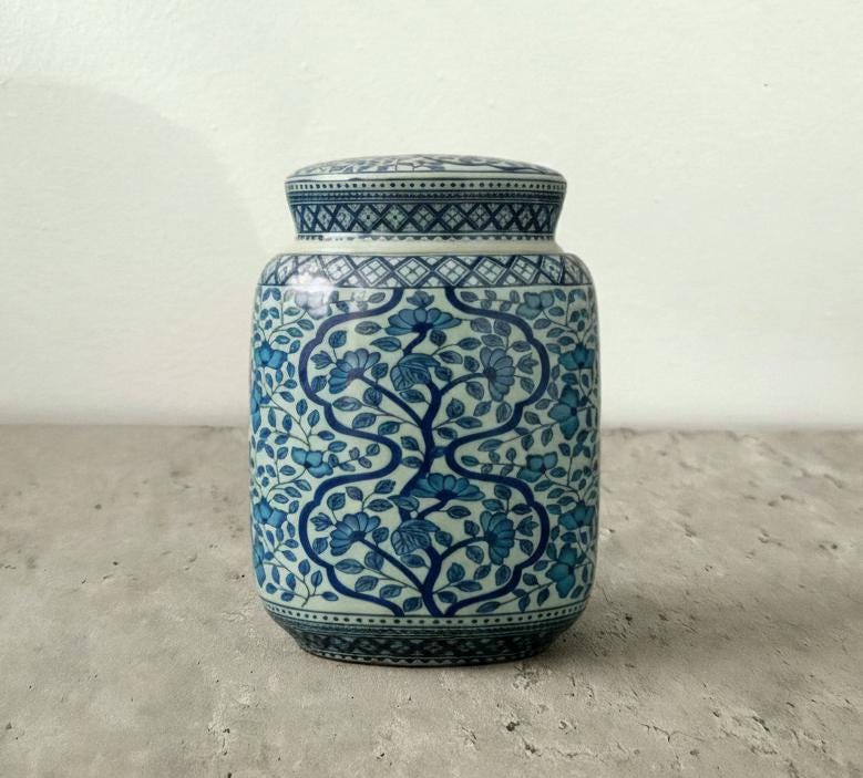 This blue and white ceramic jar with lid is a stunning piece of Chinoiserie-inspired home decor, beautifully hand-painted with an intricate floral vine pattern. Measuring 13cm in height and 9.2cm in width, this jar is the perfect size for use as a ginger jar, tea caddy, spice jar, or decorative storage container.