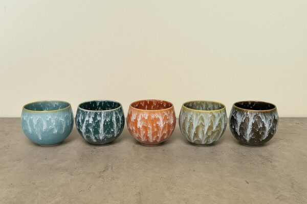 Each porcelain cup in this 5‑piece set showcases unpredictable, flowing glaze patterns that reflect natural elements—earth, fire, water, metal, wood—making each cup truly one‑of‑a‑kind.