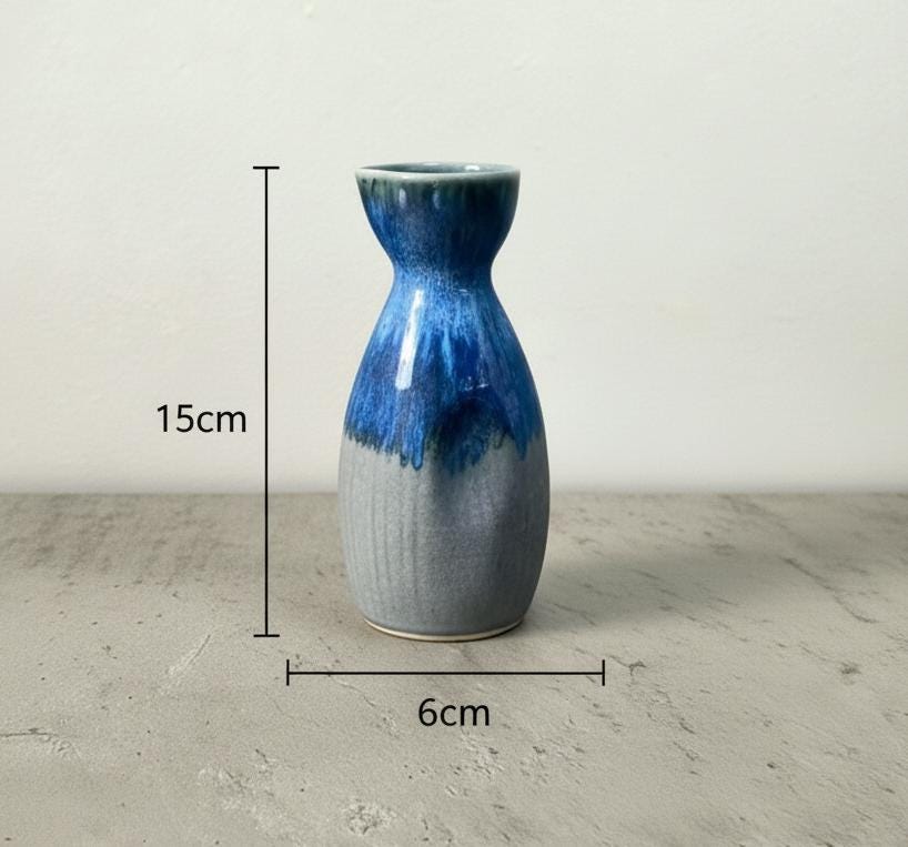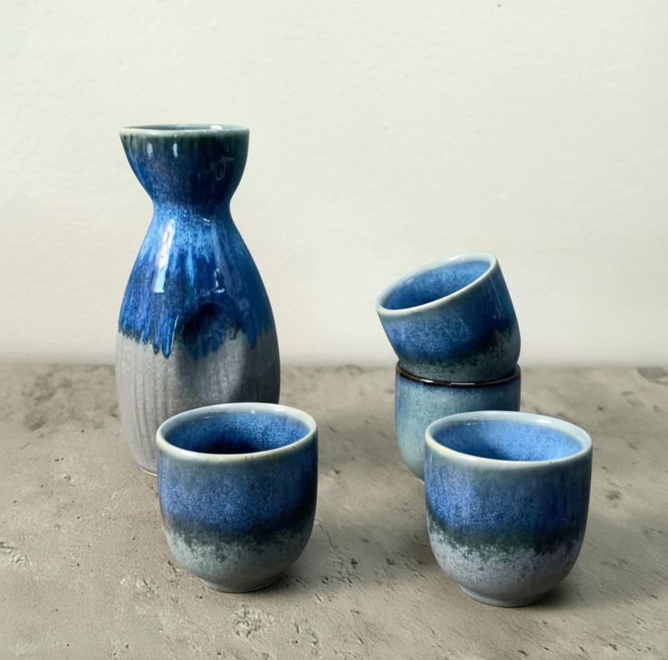 Enjoy your favorite drinks in style with this Japanese-inspired sake set, featuring a sleek blue and grey glazed ceramic sake jug and four matching cups. Perfect for sharing traditional sake, shochu, plum wine, whiskey shots, or even espresso, this set is both functional and beautifully decorative.