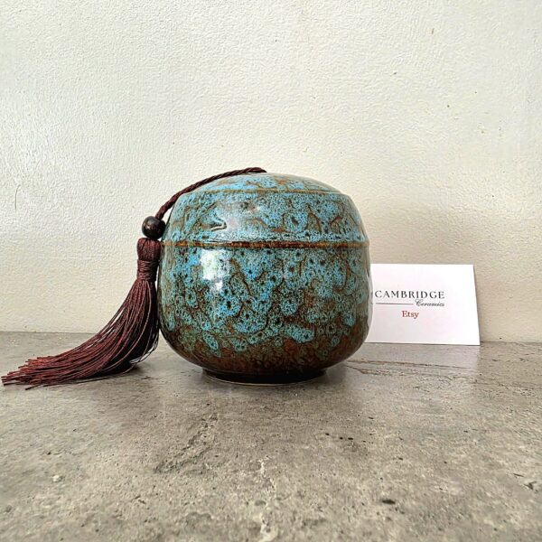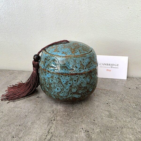 Includes: 1x blue ceramic jar with lid and tassel (tea not included)