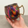 The swirling multicolor abstract pattern is full of vibrant trippy, funky, and groovy vibes—perfect for fans of bold design, 70s aesthetics, or anyone who loves fun, standout drinkware. The shiny gold handle adds a luxurious touch, making this mug a unique gift for birthdays, housewarmings, or just because.